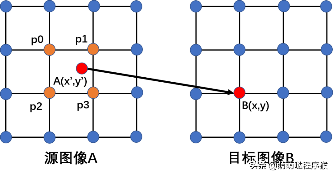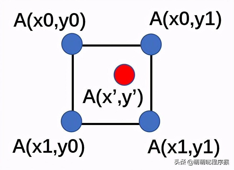 所谓插值,就是使用浮点型坐标点的周围整型点的像素值来计算该浮点型坐标点的像素值。比如上图中,点(x’, y’)为浮点型坐标点,使用其周围整型点p0、p1、p2、p3的像素值来计算其像素值A(x’, y’),这个过程就是插值。