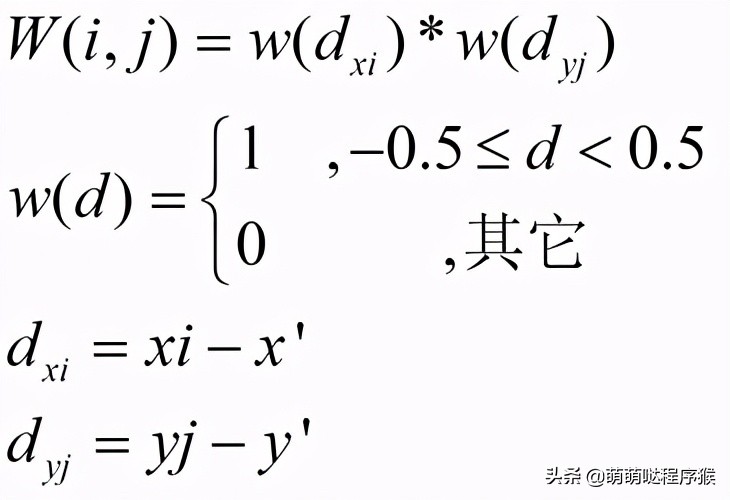 不同插值算法的区别在于权重W的计算不一样,下文将分别详细讲解最邻近插值、双线性插值、双三次插值的计算原理与实现。