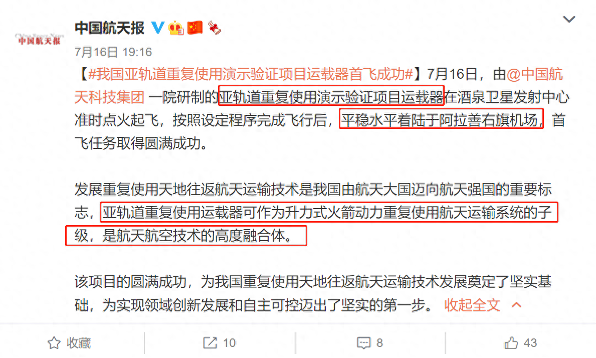 而报道中接下来的那句“亚轨道飞行器”可以作为“升力式火箭动力重复使用航天运输系统的子级”也应证了我先前的猜测。