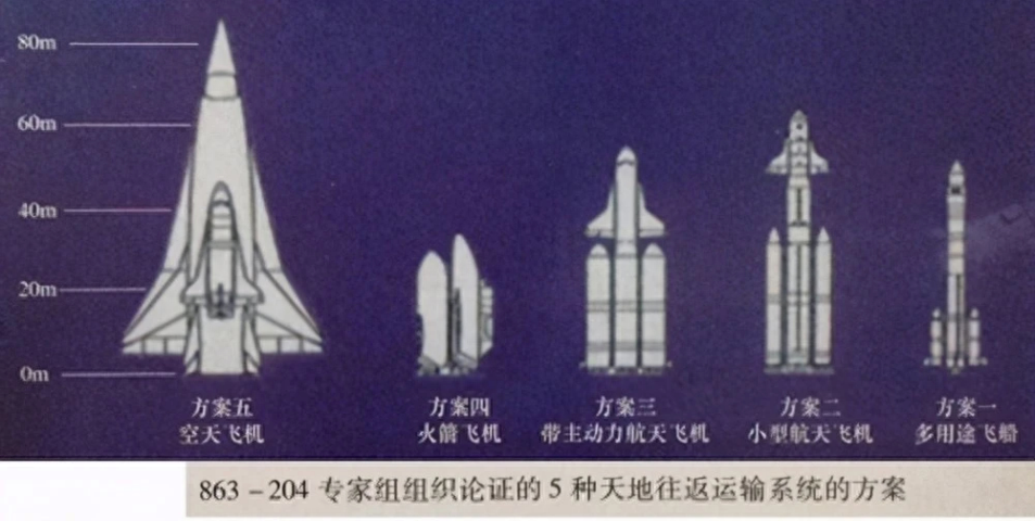 当时863计划的专家组就曾经论证过5种天地往返方案,从右往左: