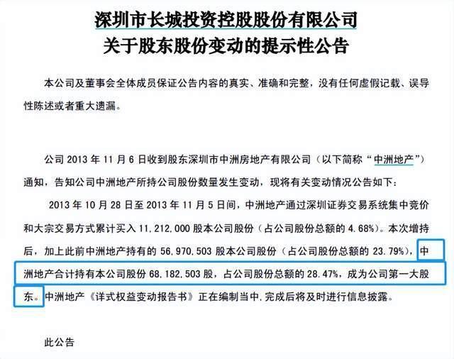 深长城原来由深圳市国资委控股,2011年,黄光苗出手举牌该公司,两年后斩获控制权,后改名中洲控股,并成为中洲集团旗下重要地产发展与资本平台。