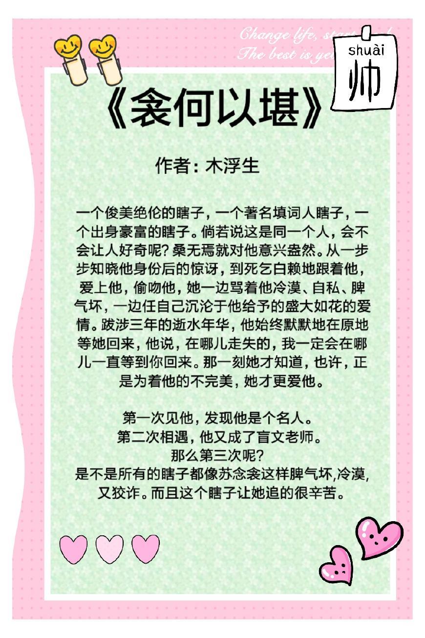 短评:很喜欢这本书,对虐男主和男主有点缺陷的文有些喜爱~看了这文便喜欢上男主苏念衾了,苏念衾是个有魅力的男人,有着小孩子脾气,很是别扭,可爱!看着无焉与苏念衾之间幼稚的吵架,挺有趣的!这本是真的百看不厌,甜虐甜虐相得益彰。男主眼盲,真是因为这点所以有一点敏感,又爱女主的紧。超喜欢。看的心纠纠又甜蜜蜜的。女主也对男主很好。男主占有欲强的紧,喜欢喜欢!