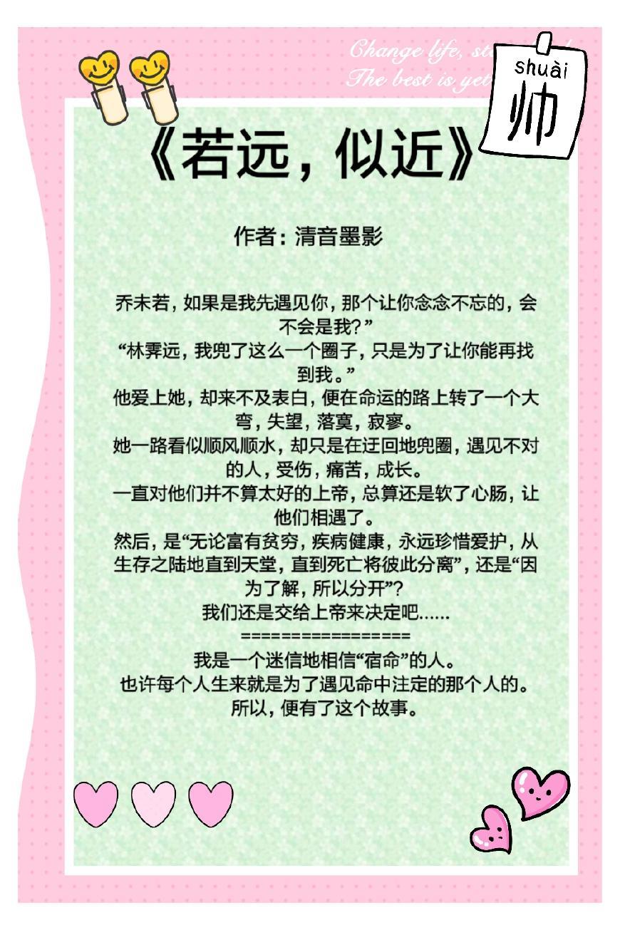 短评:南竹相当痴情暗恋了女主十年,18岁那年本来想去和女主告白可是却出了车祸失去一条小腿南竹又查出可能患有隐性家族疾病,然后南竹变的外表冷酷内心却相当的自卑,十年后女主失恋换了工作却是做南竹的助理然后故事开始了...乔未若与林霁远日久生情,走到一起。但乔未若与前男友韩苏维曾经的一段感情,却始终是林霁远心中的一根刺。因为一些外在原因,两人最终分手。后来乔未若得知林霁远自己分手是迫于她妈妈的压力,以及对自己身体、两人未来的深深担忧。在乔未若的坚持下,两人终于摒弃了一切担忧顾虑,携手走过人生之路。