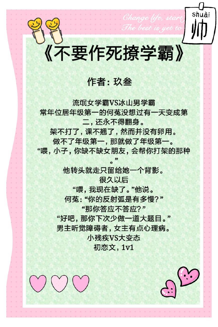 短评:是一本非常好看的完结校园言情小说,全文讲述了流氓女学霸何菟和冰山男学霸岑清铭之间的爱情故事,男主岑清铭听觉障碍者,女主何菟有点心理病,常年位居年级第一的何菟没想过有一天变成第二,还永不得翻身。架不打了,课不翘了,然而并没有卵用。既然做不了第一,那就做第一的女朋友吧