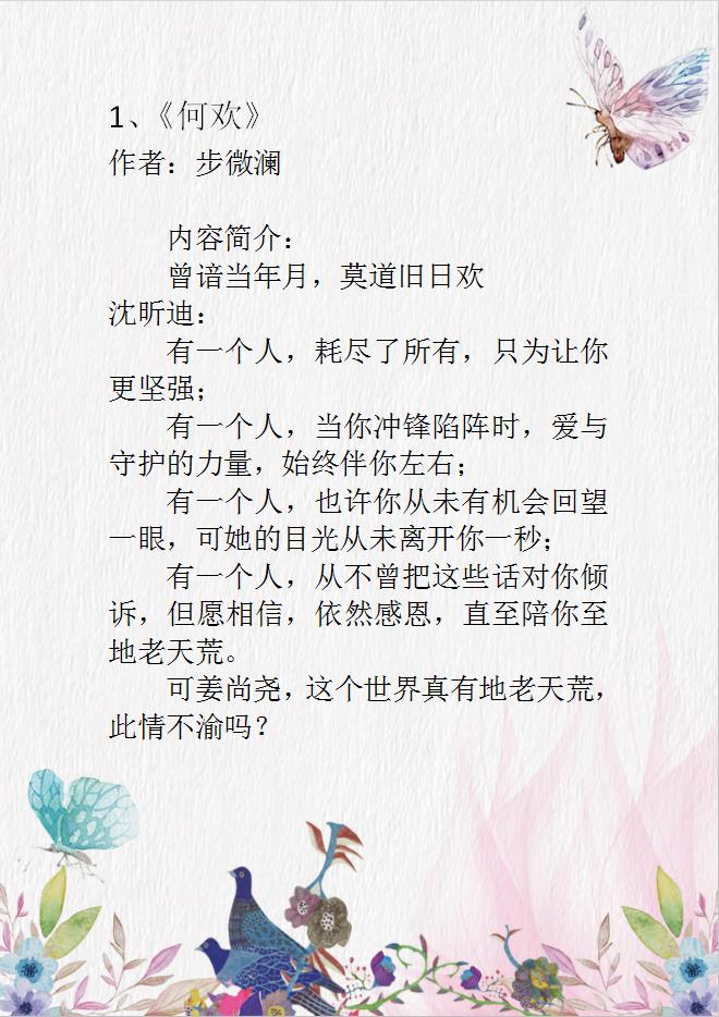 《何欢》——在人一生的际遇中,总会遇到形形色色的事情,同时也会经历人生的低谷期和高峰期,无论在哪一个时期,如果有人真心相伴,那么厄运就会消散一半,而幸福也会递增数倍。
