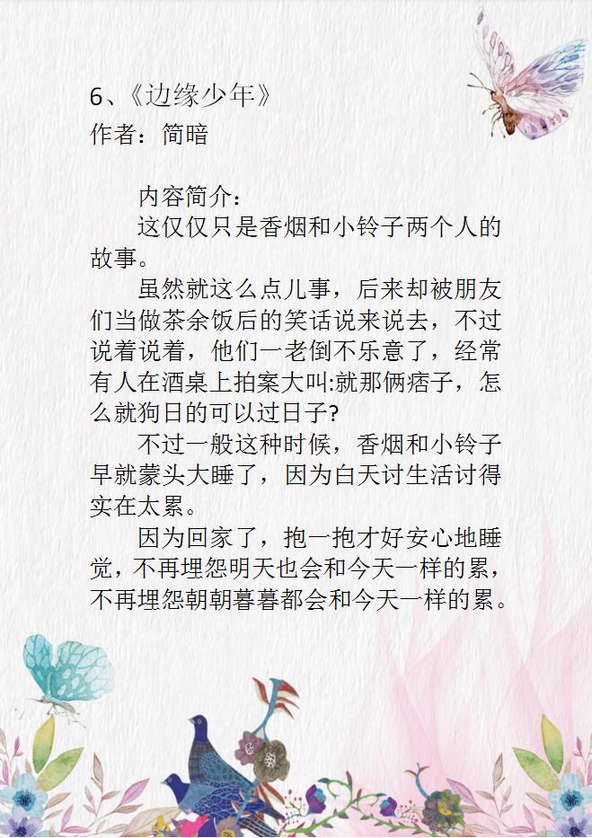《边缘少年》——讲述的是坐牢的间谍和监狱女教师之间的爱情故事。短短六万字间十来个人物的人生都栩栩如生,情感分明。兄弟情谊和生死大义的抉择,爱情的选择和等待都具有电影般的迷离感觉。