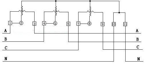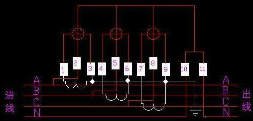 图中可以看出,1、3接线柱;4、6接线柱;7、9接线柱分别为A、B、C三相电流线圈,1、4、7接线柱接电源侧A、B、C。3、6、9接线柱接负载。2、5、8接线柱为电压线圈。10、11接线柱接零线N。