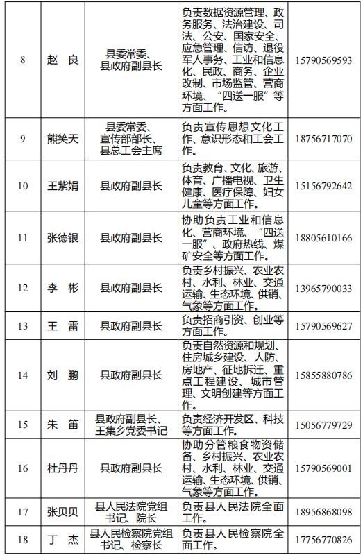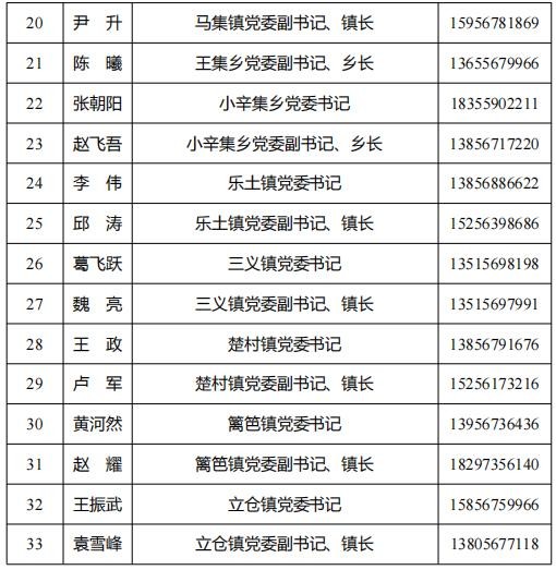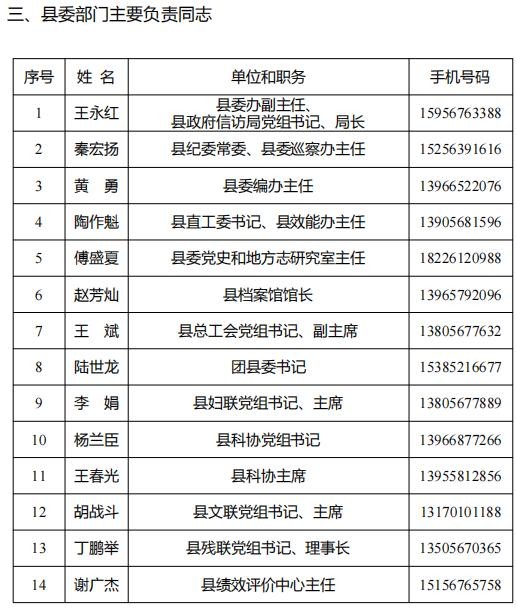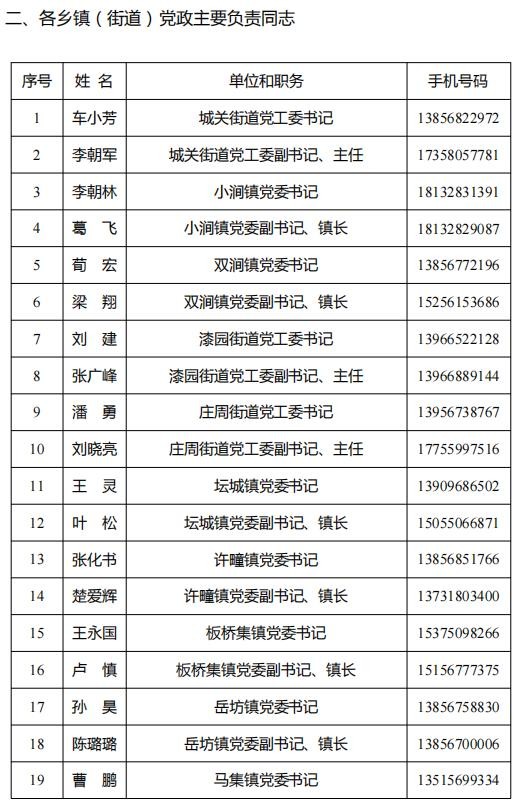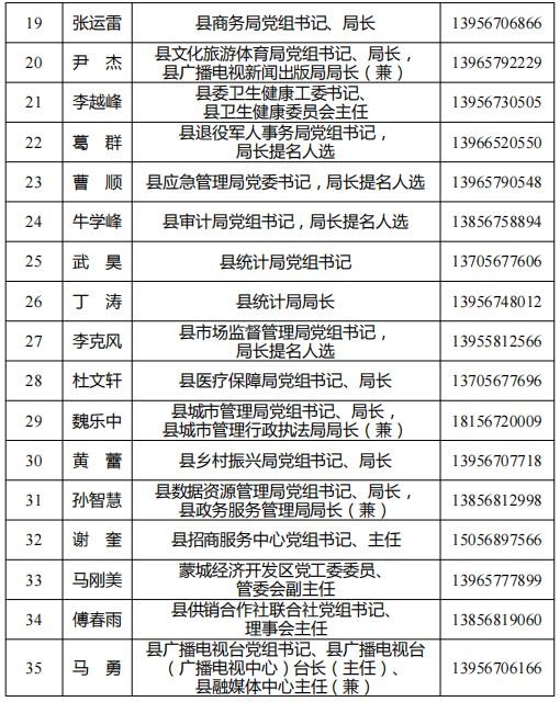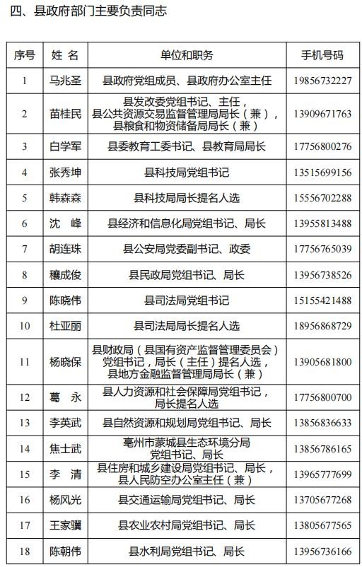 蒙城公布县及各乡镇(街道)、县直各部门负责同志手机号码