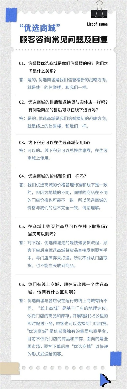 信誉楼优选商城与各门店运行的线上商城有所不同:“线上商城”是基于门店的地理定位,依托门店的商品和库存,开展辐射3-5公里的即时配送业务,顾客也可以选择到门店自提;“优选商城”是信誉楼百货集团设立的电商平台,目前不依托门店的商品和库存,面向的是全国市场,顾客下单后由“优选商城”以快递的形式寄送给顾客。