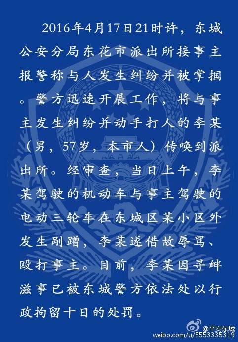 平安北京官方微博通报了这一事件的处理结果,打人者李某因寻衅滋事,被依法处以行政拘留十日。