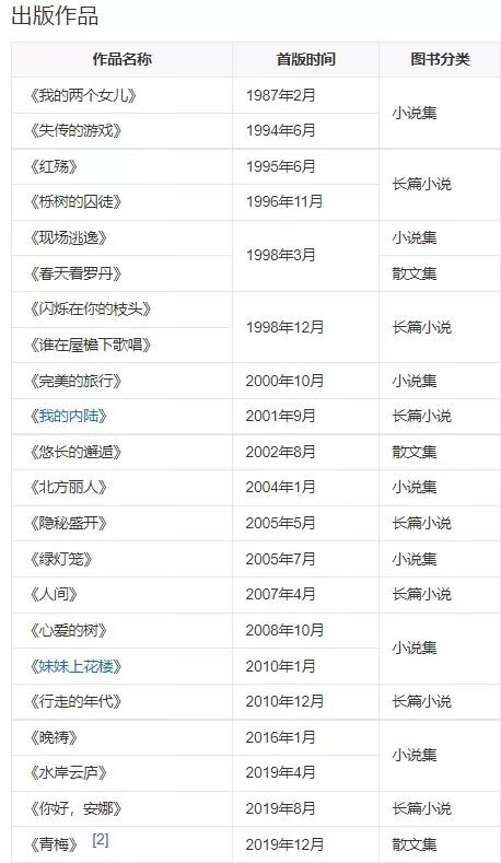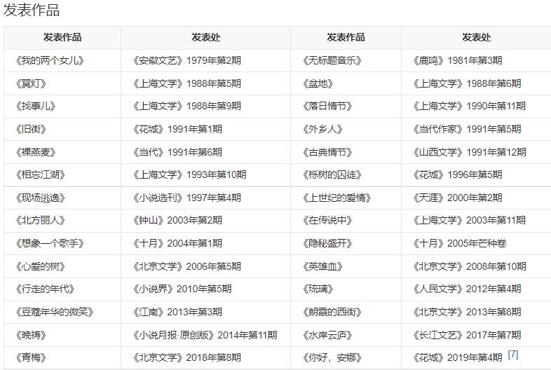 1979年开始发表文学作品,已出版发表小说、散文随笔等近300万字。1987年,推出小说集《我的两个女儿》。1995年,出版首部长篇小说《红殇》。2005年5月,出版长篇小说《隐秘盛开》。2007年10月,小说《心爱的树》获第四届鲁迅文学奖中篇小说奖。2019年8月,出版长篇小说《你好,安娜》。