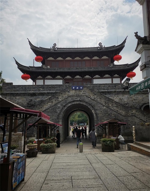 城门采用青石堆砌而成,城楼为歇山重檐式二层楼阁,四个大红灯笼随风而起,格外显眼。古时用来守护城池的城门在现代成了供人观赏的建筑,其中缘由自是令人感叹,但这也何尝不是一种实现价值的方法。人们登上城楼,俯瞰古城,房屋起伏之间,仿佛又回到了人群熙攘、古装盛行的时代。