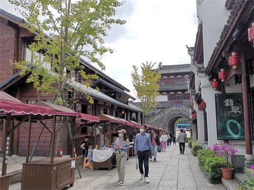 再往西就是古玩街了。古玩街一部分建在城墙之上,一部分处在城墙之下,上下错落,中间以林木花池点缀,层次丰富,观赏性十足。
