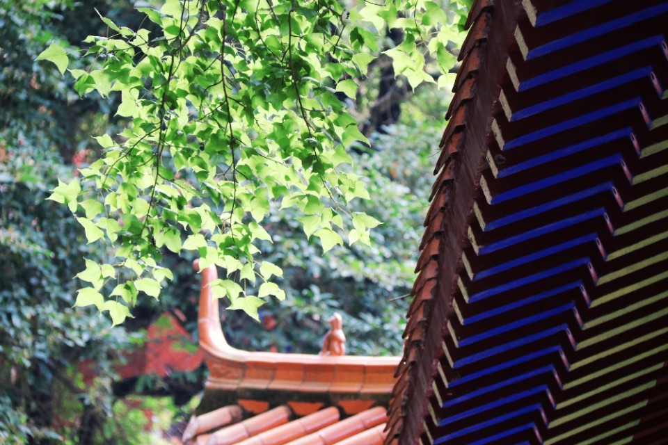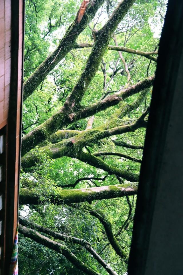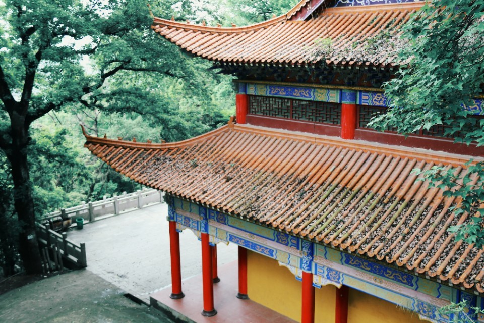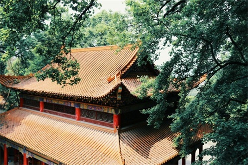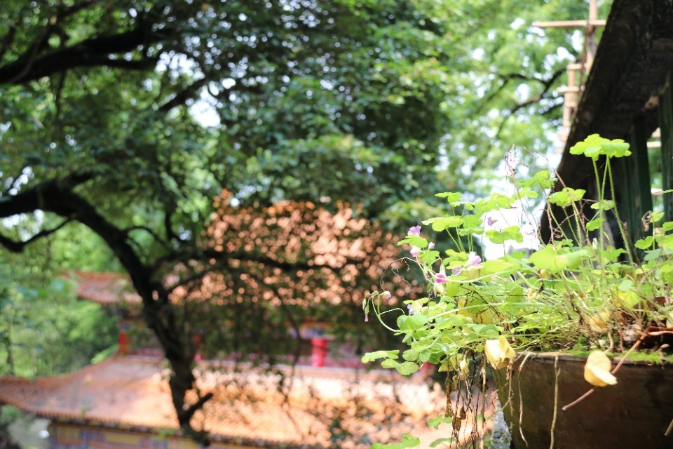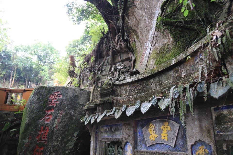 殿后怪石嶙峋,有龙跃虎踞之势,直欲凌云而上,大树参天,古朴苍劲。