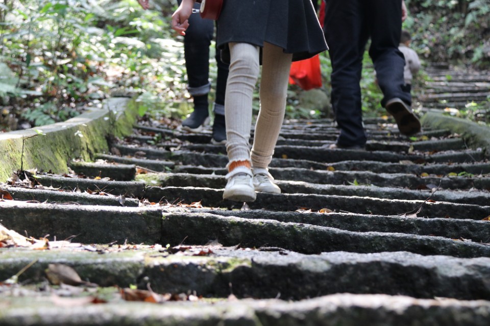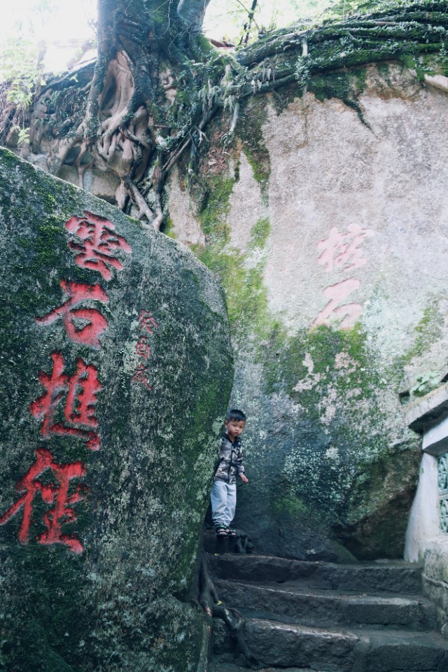 这样的岩石阶梯共470级,古称“云石樵径”,上岩必沿石径拾级以登。枫叶落在石阶上,踩着沙沙响,虫鸣鸟语、光斑淋漓、流水潺潺,时光荏苒,古今往来多少文人墨客在此吟诗作赋,挥洒笔墨啊!