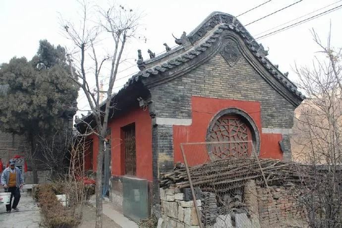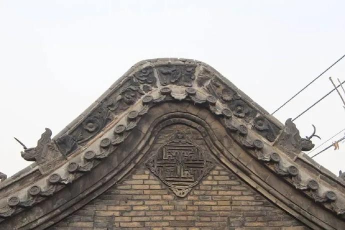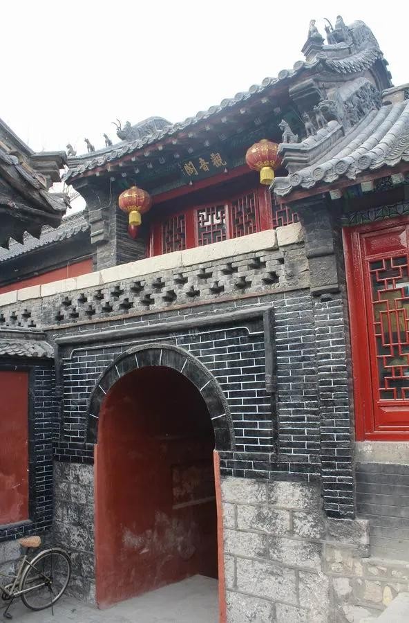 2、大门很有特点,两层,上面是观音阁。拱劵门,进门后迎面是一面影壁,灰砖灰瓦,正中是个福字,四角各有一只蝙蝠。