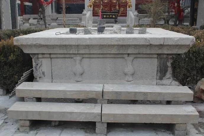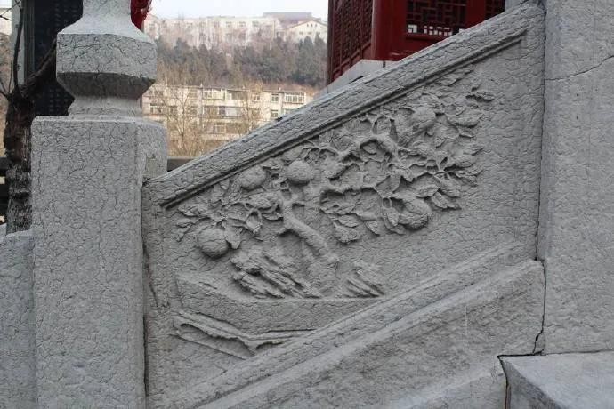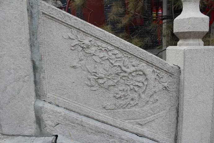 ,东面同在高台上的是四角攒尖顶的荷景亭,荷景亭北侧就是一堵矮墙,可以看到外面的妇孝河,大殿西侧有一院门通往后院,院门北侧是并排着的厢房,分别为忠义殿和财神殿。在大殿正中,一座石质正方形香炉,如此形状香炉我是第一次见。大殿前面的石阶栏板上的石雕仙桃奇石十分精彩,西面雕刻的还是繁花满枝头,东侧则是硕果累累。雕工很精湛。