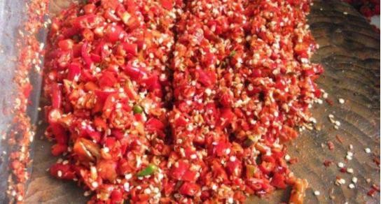我们选用色泽鲜红,新鲜的二荆条辣椒,摘去辣椒把子洗干净,然后晾干水分。接着用刀剁细,然后将其放入干净的盆中,加入青花椒,香叶,仔姜(仔姜也剁细),适量的盐搅拌均匀。然后倒入干净的泡菜坛子里,最后倒入适量的纯菜籽油,盖上坛子的内外盖,加入坛沿水密封一个月(密封期间需要更换坛沿水)。一个月后就可以食用了。