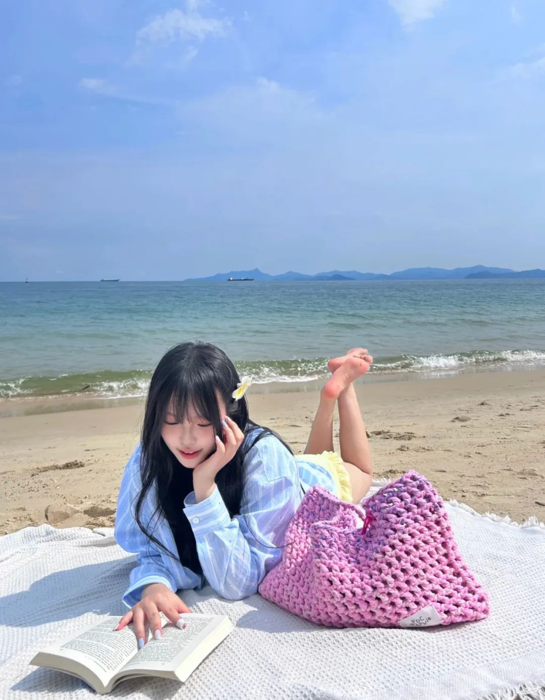粉色编织包作点缀,丰富画面元素。整体姿势慵懒随性,凸显度假氛围感与青春活力。
