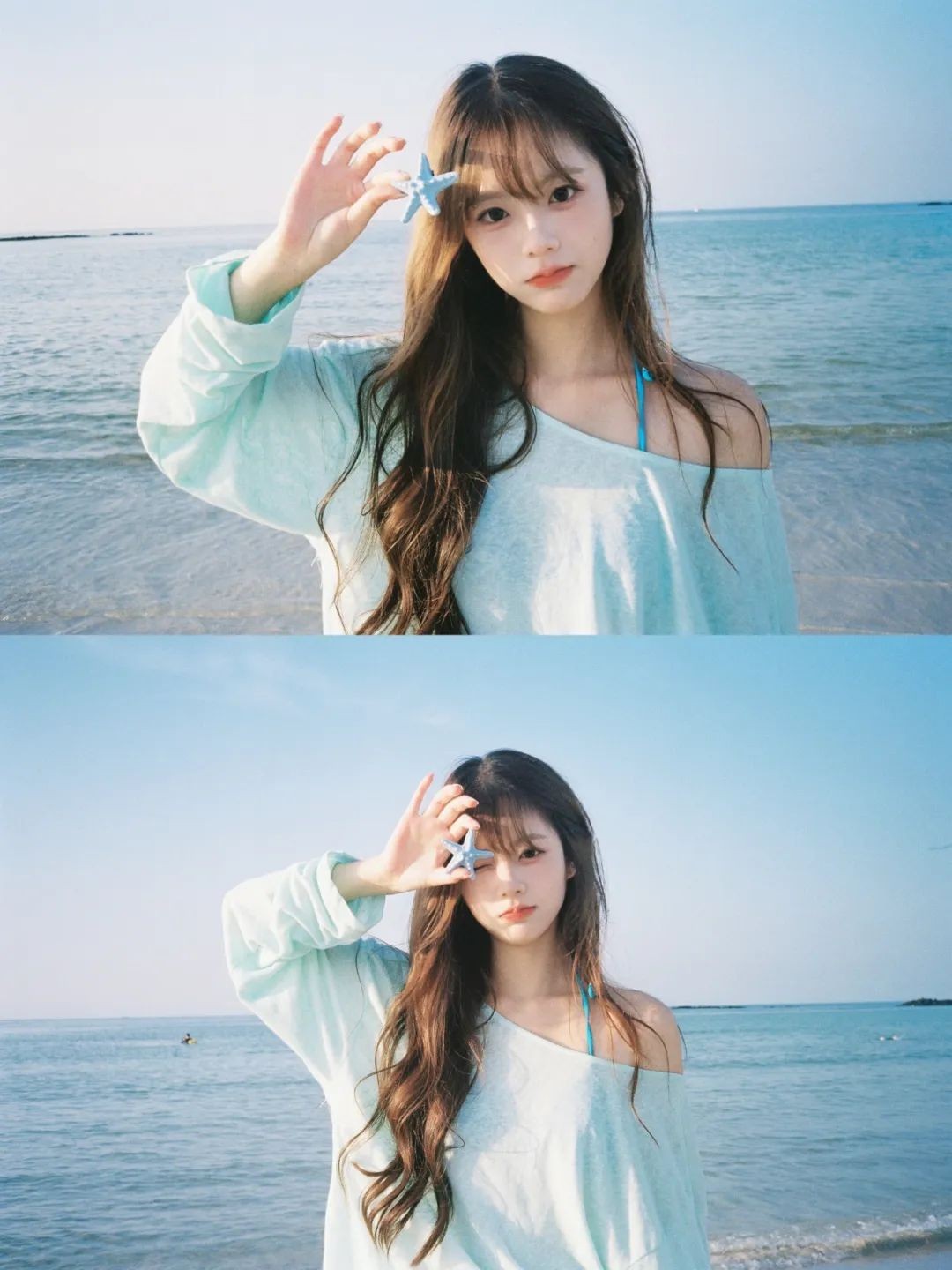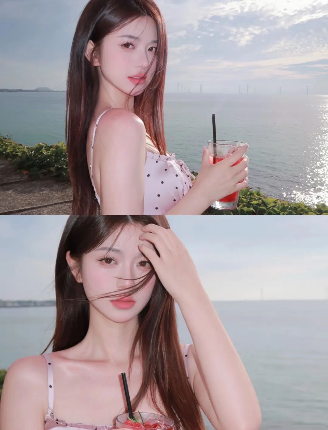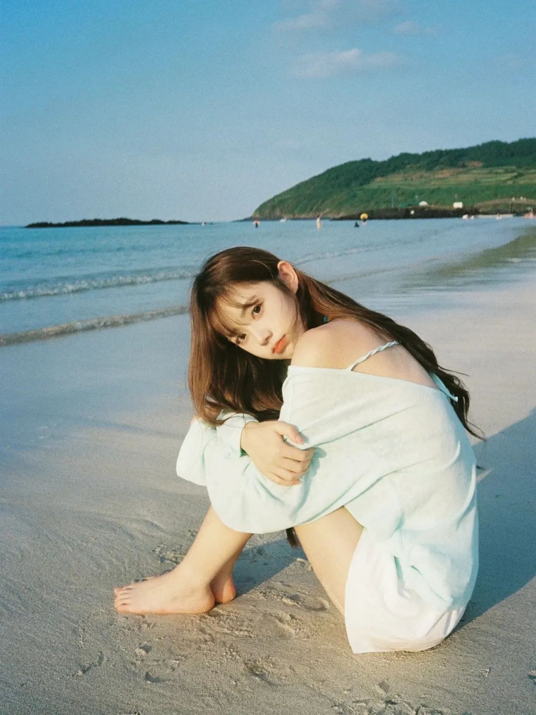 背后海浪轻拍,营造悠闲氛围。整体姿势自然,表情灵动,凸显青春甜美气息。