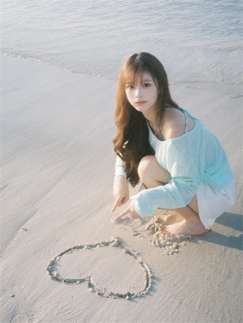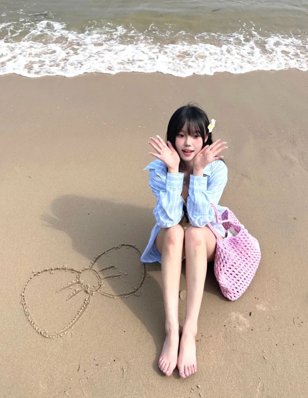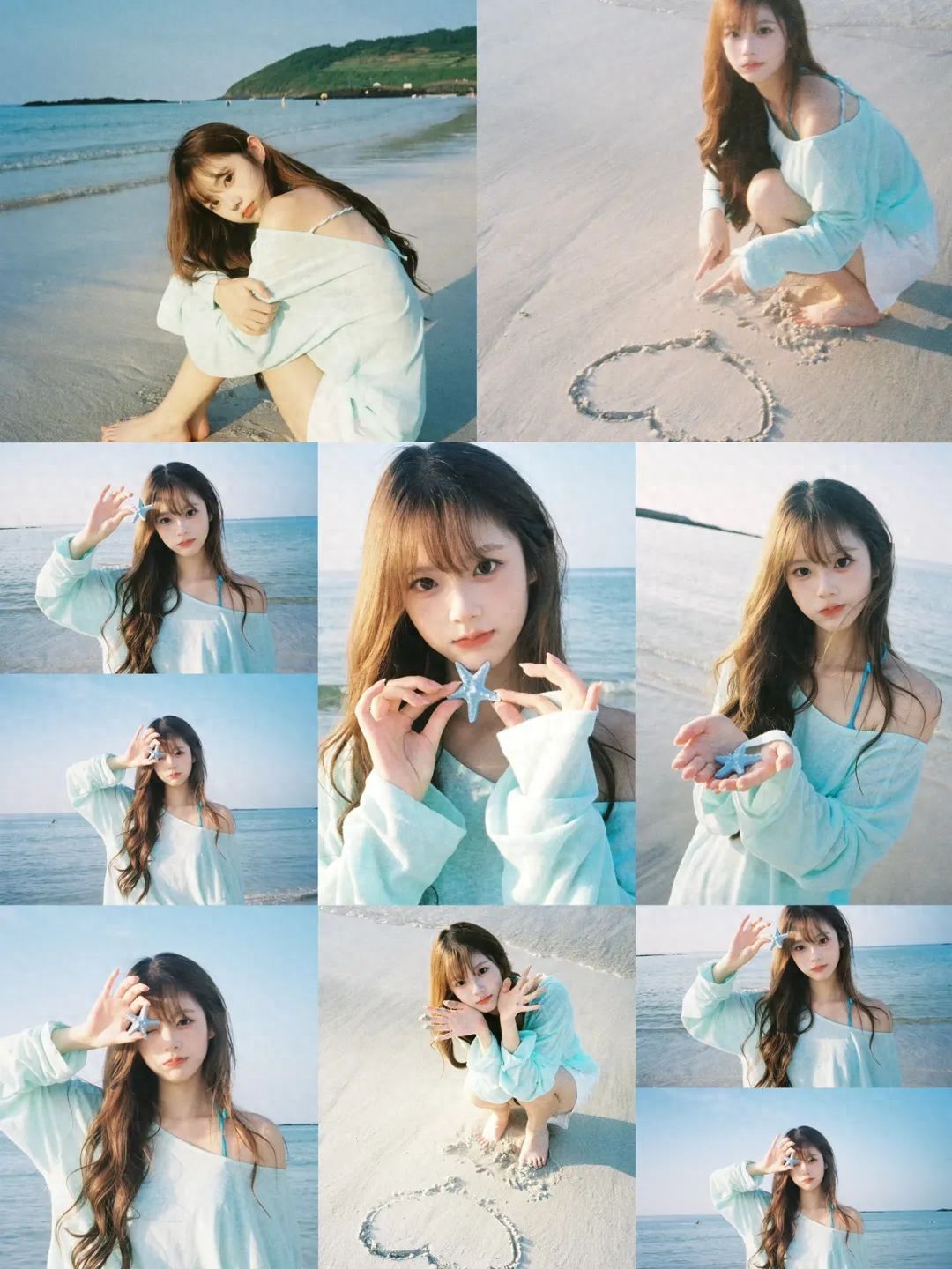 背后海浪轻拍,营造悠闲氛围。整体姿势自然,表情灵动,凸显青春甜美气息。