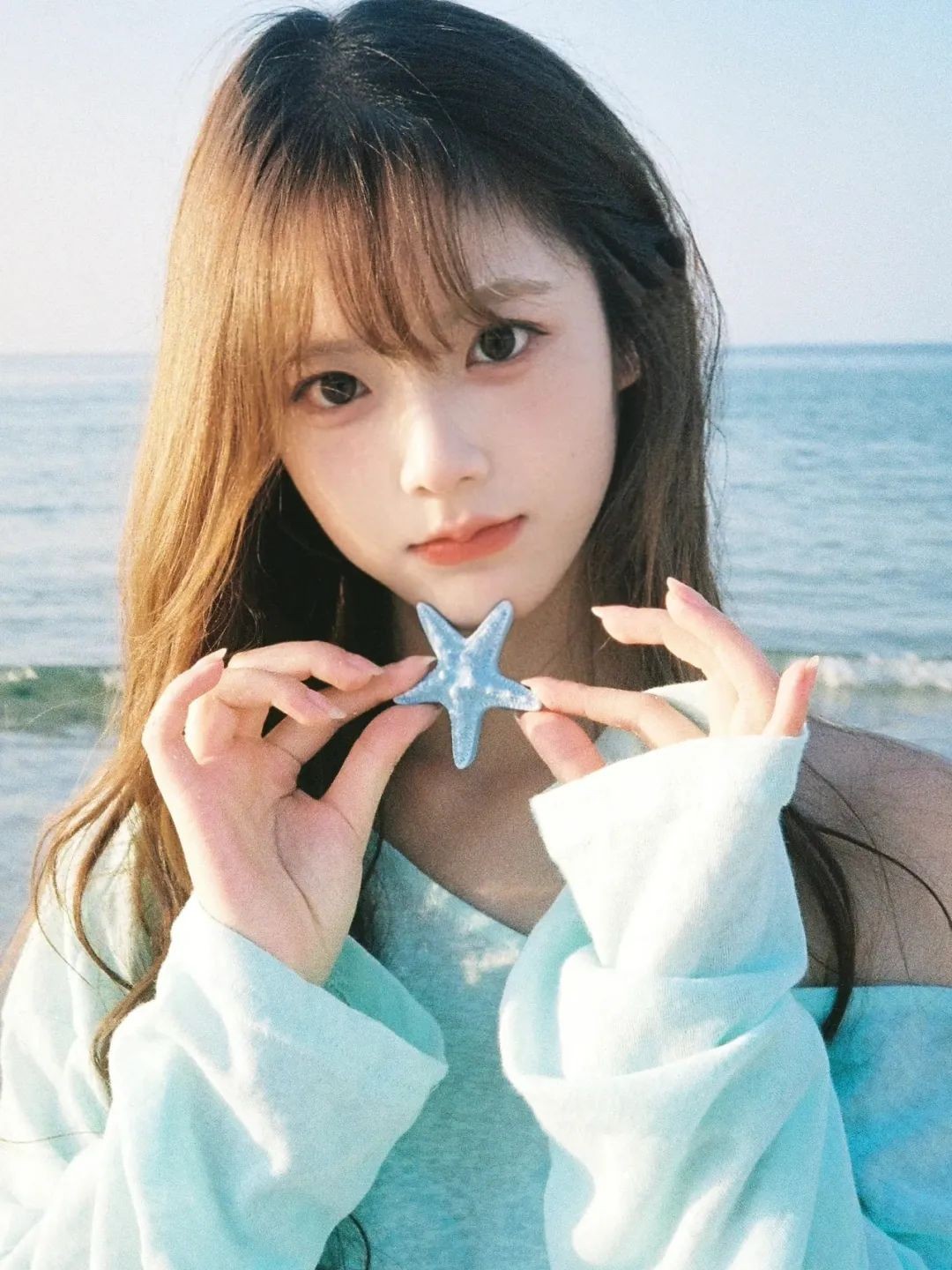 双手轻托,将海星置于掌心展示,微微低头看向镜头,眼神专注又灵动。