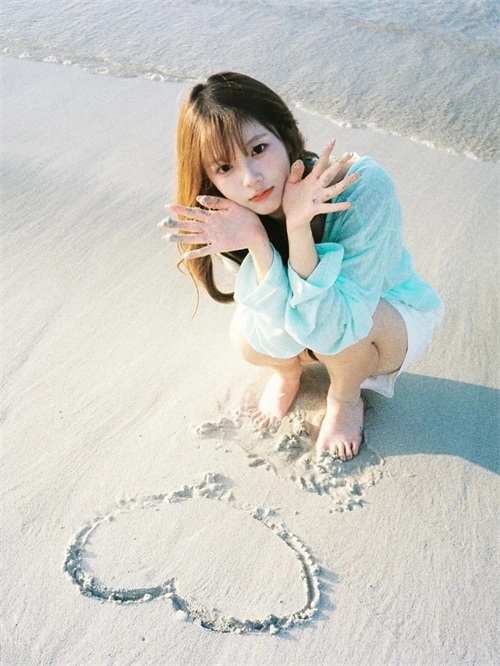 指尖沾沙,增添随性。身前心形沙画丰富画面元素,与大海背景呼应。