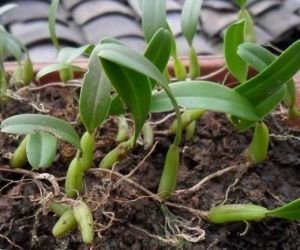 独叶岩珠叶薄革质,狭长圆形或倒卵状披针形,长3-4厘米,罕有达9厘米的,中部宽5-7 (-14) 毫米,先端近锐尖,基部收窄为长4-10毫米的柄,边缘稍波状,上面中肋常凹陷。花葶从假鳞茎基部发出,纤细,直立,光滑无毛,高出叶外。