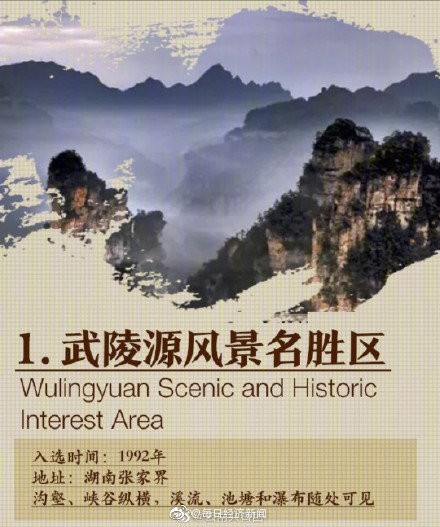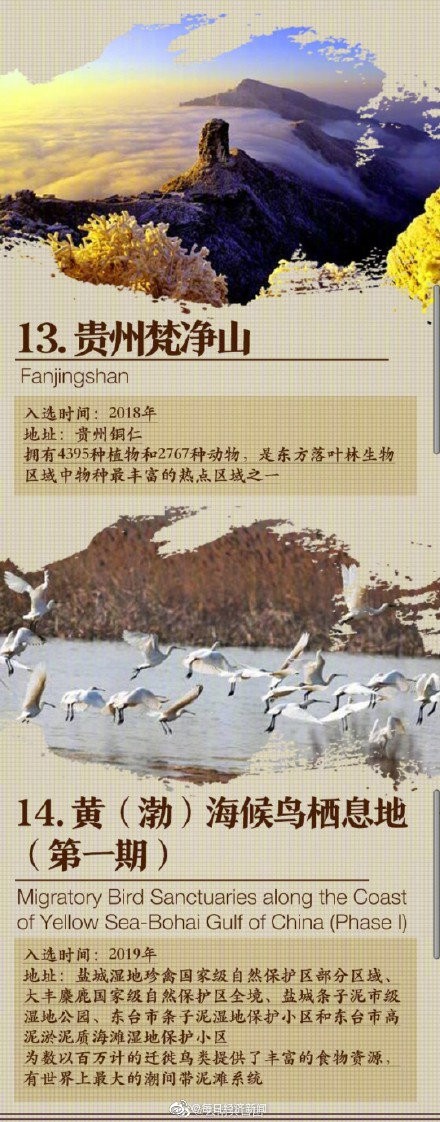 【中国已拥有14项世界自然遗产,看看都有哪里?】中国世界自然遗产有:1.黄龙风景名胜区;2.九寨沟风景名胜区;3.武陵源风景名胜区;4.云南三江并流保护区;5.四川大熊猫栖息地;6.中国南方喀斯特 (South China Karst);7.三清山国家公园 (Mount Sanqingshan National Park);8.中国丹霞 (China Danxia);9.澄江化石遗址 (Chengjiang Fossil Site);10.新疆天山 (Xinjiang Tianshan);11.湖北神农架 (Hubei Shennongjia);12.青海可可西里 (Qinghai Hoh Xil);13.梵净山 (Fanjingshan);14.中国黄(渤)海候鸟栖息地(第一期)。(图片来源:@人民日报,泽塔)