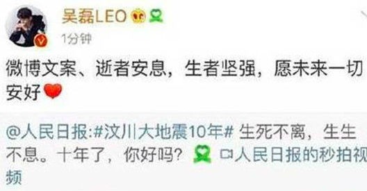 今日上午,吴磊转发微博纪念汶川大地震十周年时,文案中出现了“微博文案”四个字,引发网络热议。对此,吴磊工作室发声明道歉,称是因为工作人员一时疏忽,造成此次重大失误,现已对相关工作人员作出严厉处罚,工作室也深刻反省,会引以为戒,讷言敏行。