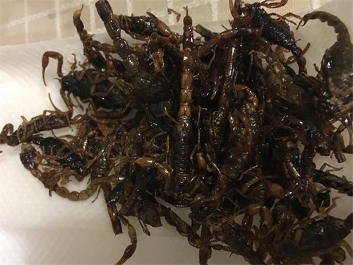 这次做油炸蝎子做足了功课。之前就是把蝎子在水里清洗一下,晾干油炸,吃起来总有泥土味,因知道它的功效,因而把它当成一味中药下咽。