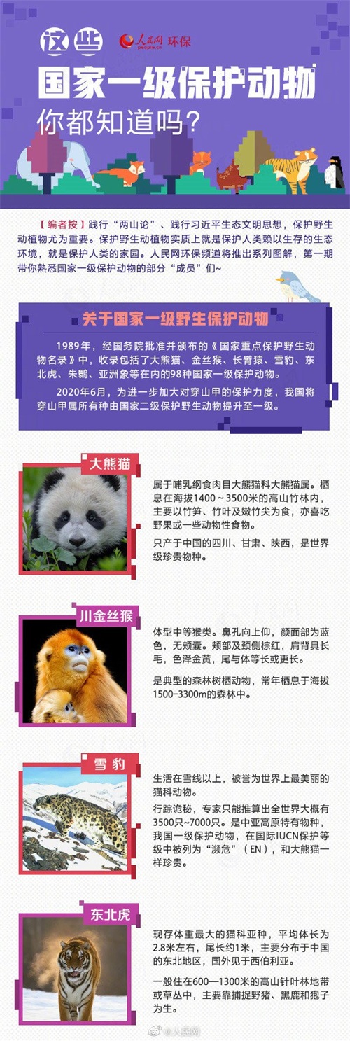 【介绍一下:这几位是国家一级保护动物】保护野生动植物,实质上就是保护人类赖以生存的生态环境,就是保护人类的的家园。今天带你认识国家一级保护动物。欢迎第1期主角登场:大熊猫、川金丝猴、雪豹、东北虎、亚洲象、朱鹮、白尾海雕、中华穿山甲。(人民网环保频道)