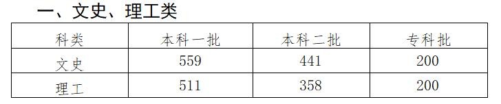 高水平运动队考生高考文化成绩控制分数线:文史441分,理工358分;对于少数体育专项测试成绩特别突出的高水平运动队考生,文化成绩控制分数线:文史286分,理工232分。