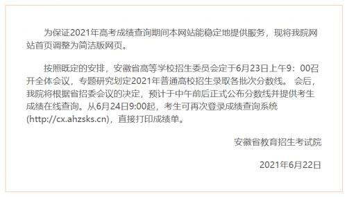 经过十多天紧张有序的阅卷评卷及统分合成,安徽省将于6月23日中午前后,发布2021年普通高校招生录取控制分数线并公布高考成绩。