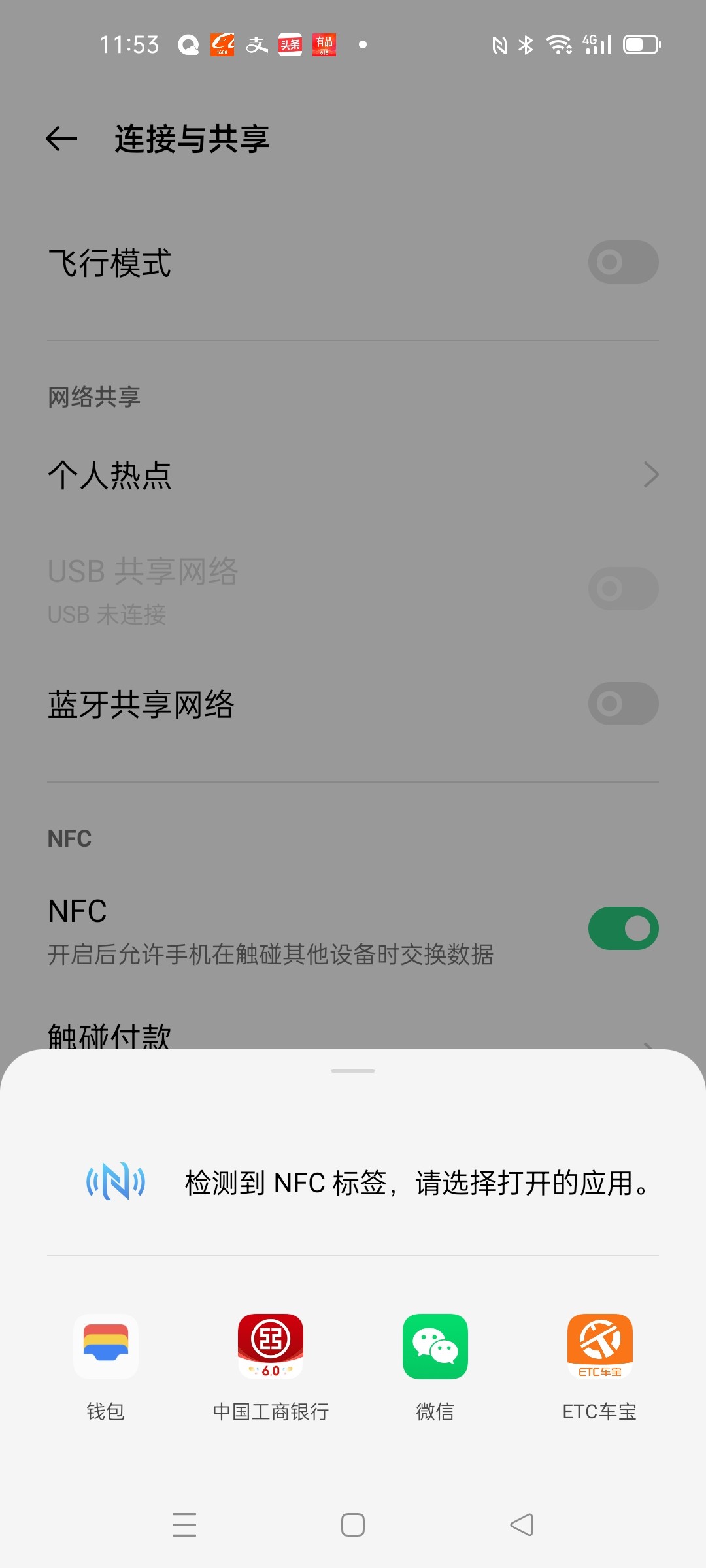 一,打开连接与共享,选择“NFC”,把门禁卡放在手机背面靠上的地方,手机上会弹出一个选择钱包提示。然后选择“钱包”。