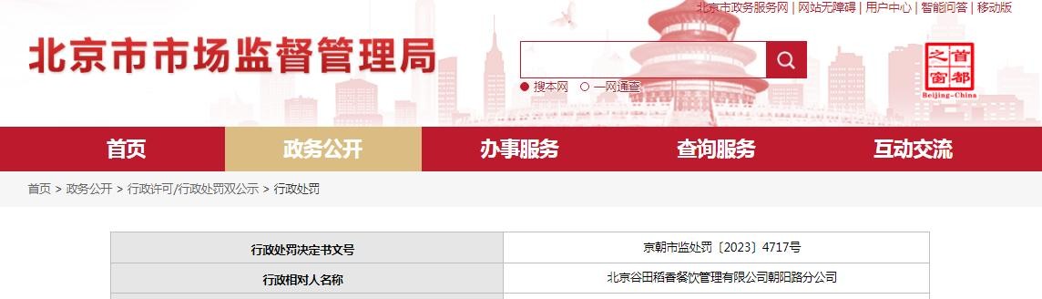 关于对北京谷田稻香餐饮管理有限公司朝阳路分公司行政处罚信息(京朝市监处罚〔2023〕4717号)