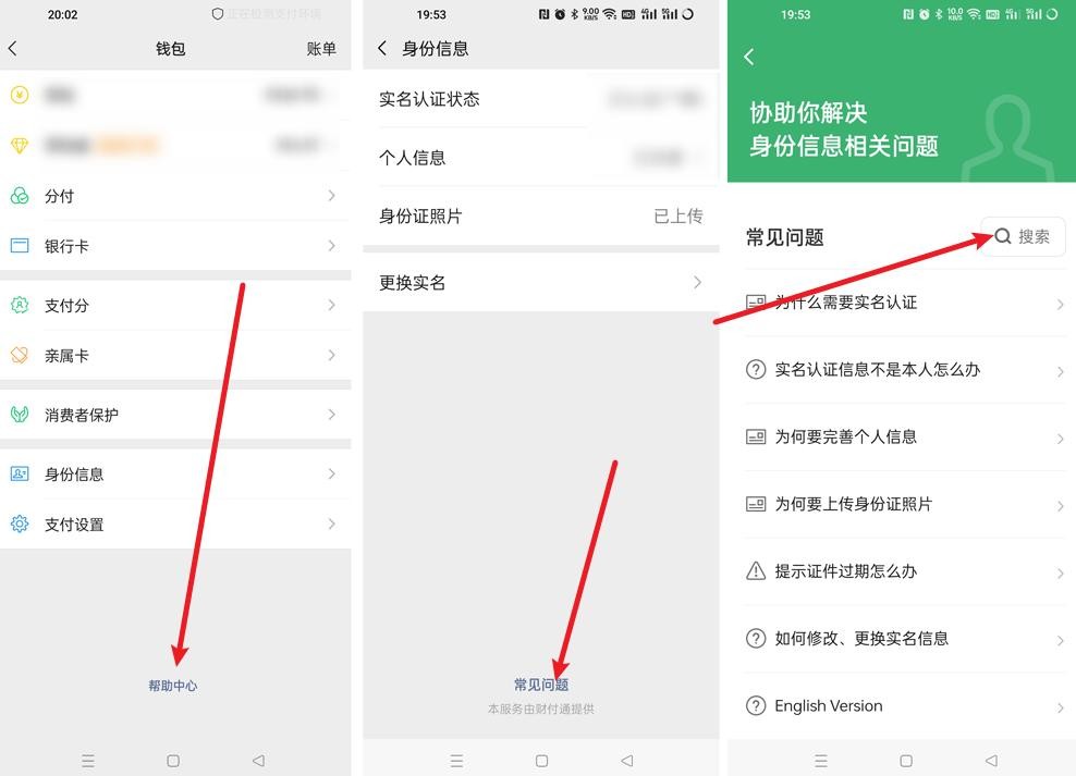 2、接着点击底部的【帮助中心】,小编这里已经实名了,这里点击底部的【常见问题】,然后点击【搜索】,输入“微信怎么实名认证”;