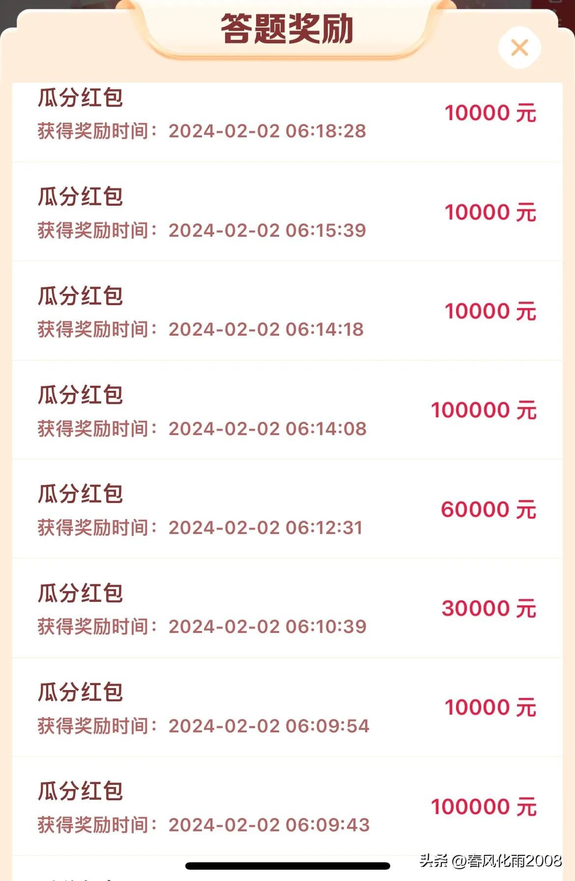 最有趣的莫过于答题赢现金,最先活动内容没有细看,不知道可以复活,还是好友提醒才知道。每次都是放弃重新答题,所以100000万分成前几天都没有拿下。今天知道规则了,10万拿下了两次,全答对了0k。