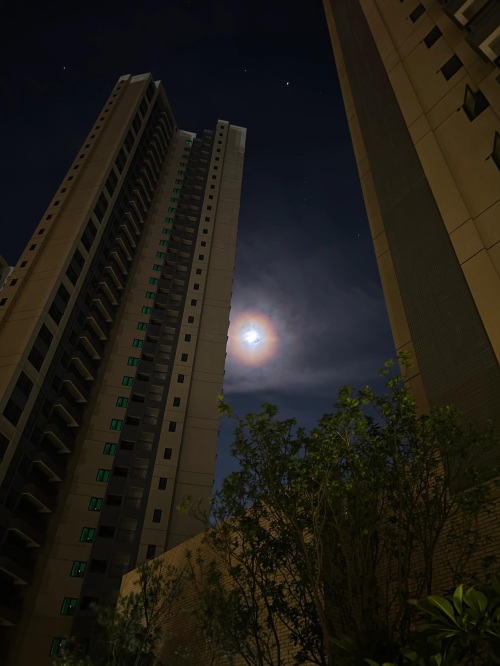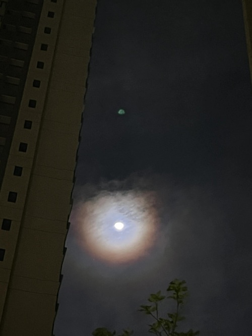 月晕,是光透过高空卷层云时,受冰晶折射作用,使七色复合光被分散为内红外紫的光环或光弧,围绕在月亮周围产生光圈。