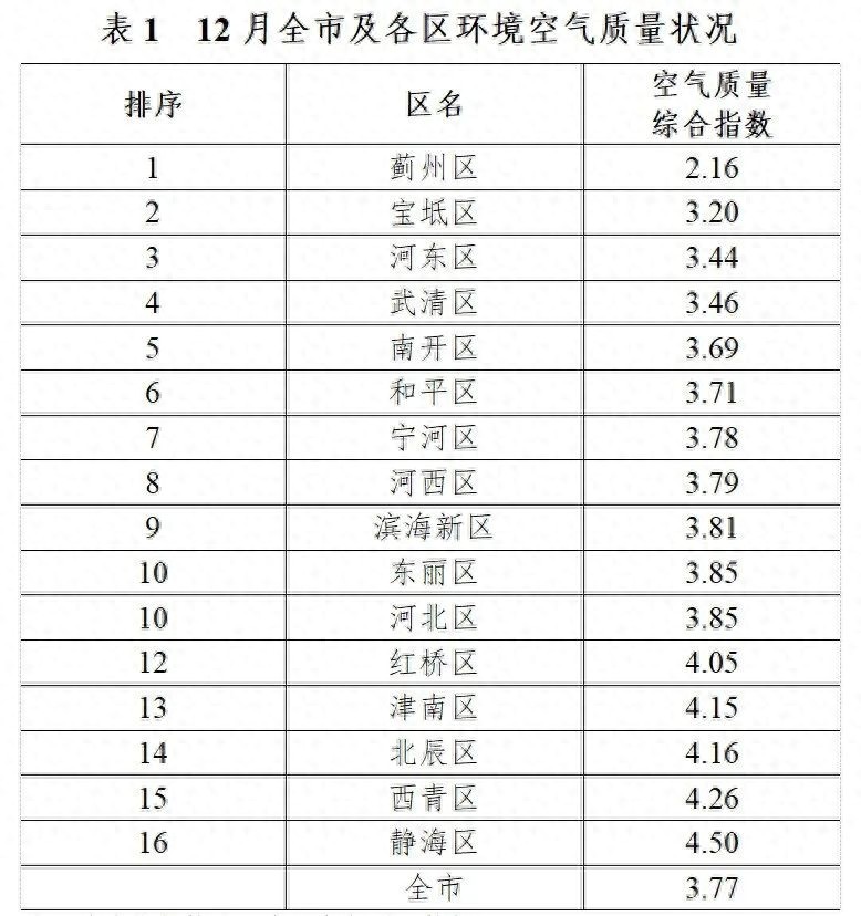 2024年12月,我市环境空气质量综合指数3.77,PM2.5浓度34微克/立方米,优良天数30天,优良天数比率96.8%,无重污染天。蓟州区、宝坻区、河东区空气质量排名靠前,静海区、西青区、北辰区排名靠后。