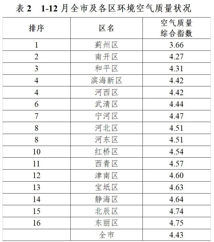 2024年1-12月,我市环境空气质量综合指数4.43,PM2.5平均浓度38微克/立方米,优良天数268天,优良天数比率73.2%,重污染天数4天(含1天沙尘)。蓟州区、南开区、和平区空气质量排名靠前,东丽区、北辰区、静海区排名靠后。