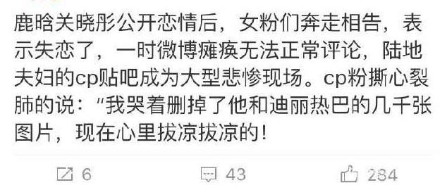 鹿晗公开恋情,大家也很想知道迪丽热巴的态度,媒体也给热巴打过电话,但是没人接,有网友质疑迪丽热巴在录制节目期间对鹿晗是投入过感情的,比如:迪丽热巴向鹿晗噘嘴撒娇,还有网友说录制节目时,迪丽热巴对鹿晗喜欢关晓彤是不知情的。