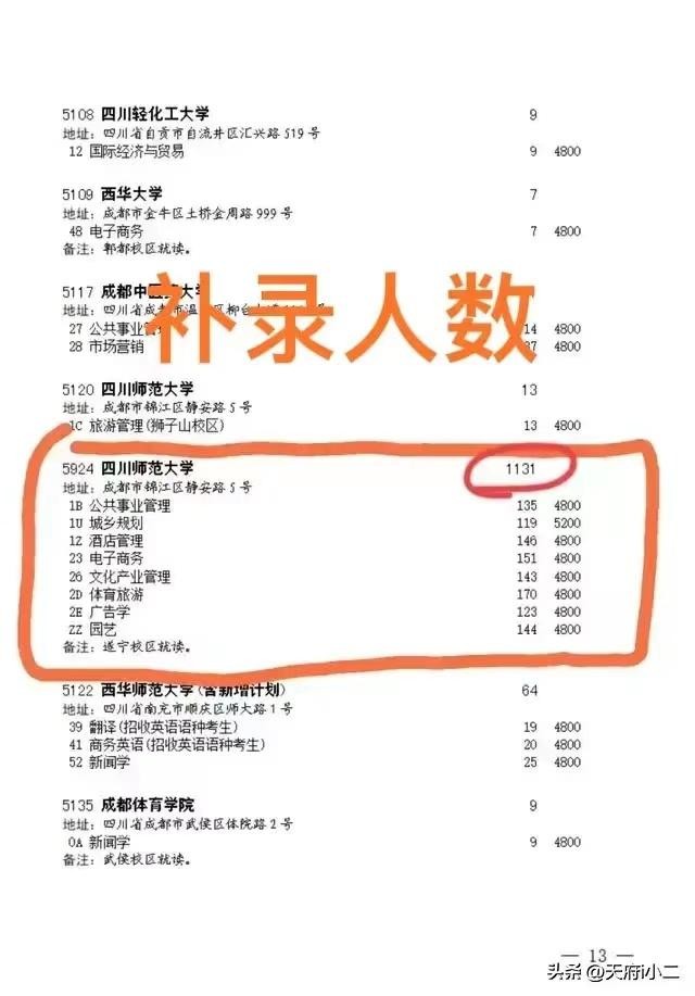 四川师范大学遂宁校区第一年招生,文科招生计划1240人出现征集计划1131人,理科招生计划1400人出现征集计划1323人。遂宁校区的专业:公共事业,城乡规划,酒店管理,电子商务,文化产业,广告,园艺,文科理科都是这些专业,这一举动引起学生的不满和批评。将不受欢迎的专业都放在了遂宁校区,明年川师大很可能会调整遂宁校区的招生专业。