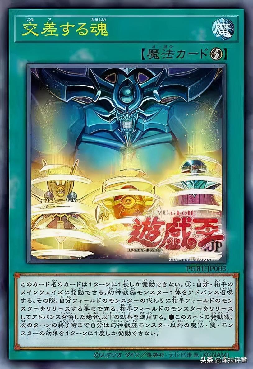 “交错之魂”(这个卡名的卡在1回合只能发动1张。①:自己·对方的主要阶段才能发动。把1只幻神兽族怪兽上级召唤。那个时候,也能作为自己场上的怪兽的代替而把对方场上的怪兽解放。把对方场上的怪兽解放作上级召唤的场合,以下效果适用。●这张卡的发动后,直到下个回合的结束时自己1回合只能有1次把幻神兽族怪兽以外的魔法·陷阱·怪兽的效果发动)最有意思的就是给三幻神全体加了一个类似“太阳神之翼神龙-球体形”的效果,且可以二速在对方回合发动(然而入连锁,解终端能力不如球体形),有了交错之魂,不管三幻神有多咸鱼,都能在出场时吃到对方怪兽,从而打断对方的展开。此卡组先手就依赖交错之魂。