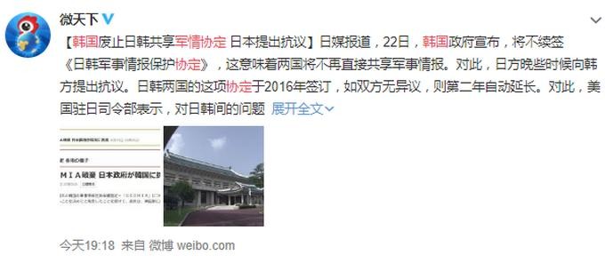 据此前报道,韩日矛盾不断升级,韩联社22日早些时候消息说,青瓦台22日表示,韩国决定废止与日本关于交换军事情报的协议,即韩日《军事情报保护协定》(GSOMIA)。韩国青瓦台表示,与日本交换军事情报不符合“国家利益”。