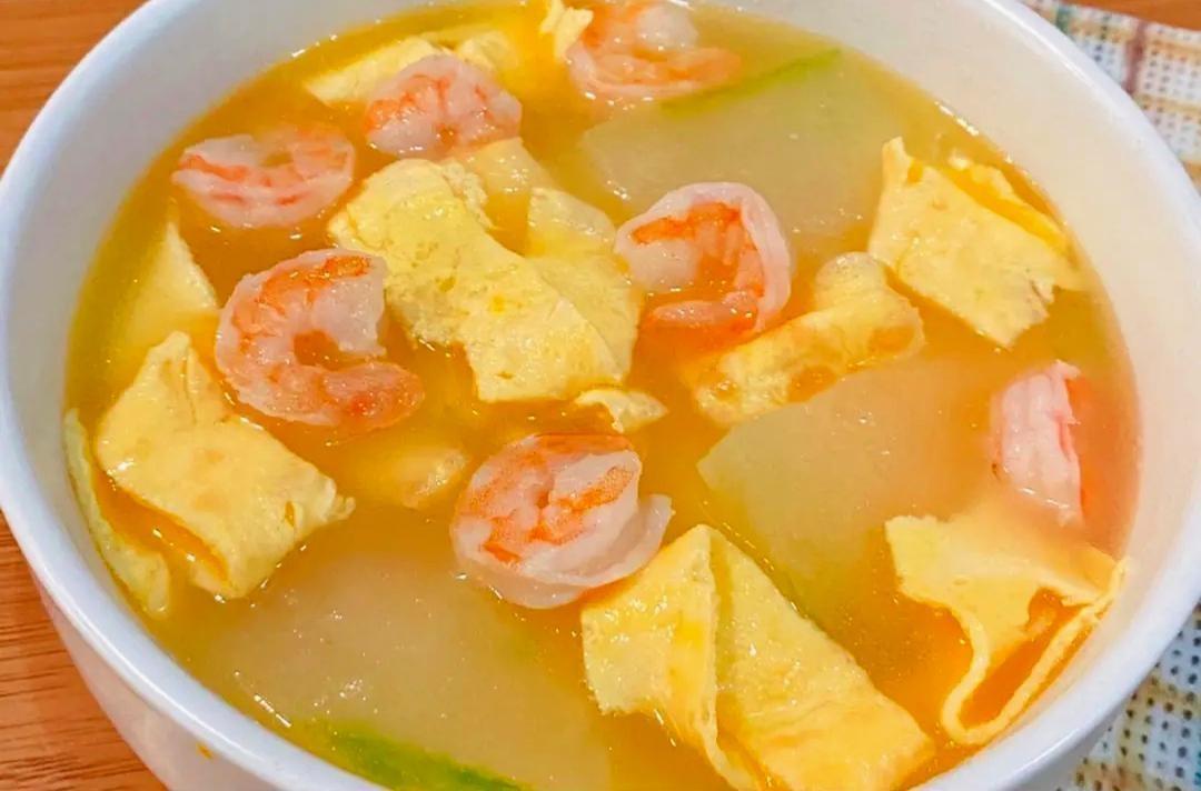 步骤三:起锅烧油,倒入虾仁炒至变色,倒入两碗清水烧开,加入冬瓜片,煮熟后放入鸡蛋条,加适量盐调味即可出锅。