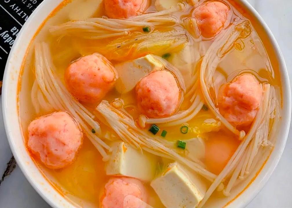 步骤四:接着放入虾丸、金针菇、娃娃菜、豆腐煮熟,最后加入少许盐和胡椒粉调味,撒点葱花、香油即可。