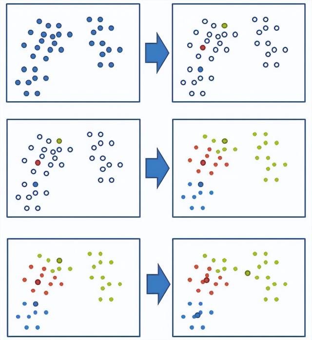 2、对于其他每个点计算到K个中心的距离,未知的点选择最近的一个聚类中心点作为标记类别
