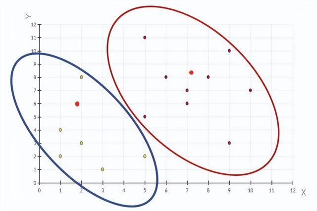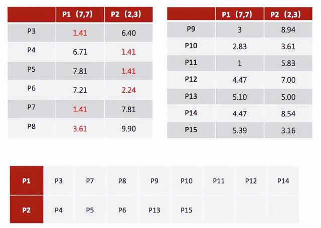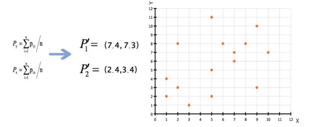 1、随机设置K个特征空间内的点作为初始的聚类中心(本案例中设置p1和p2)