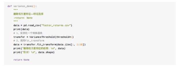 [[2,8,4,5],[6,3,0,8],[5,4,9,1]]from sklearn.decomposition import PCAdef pca_demo():"""对数据进⾏PCA降维:return: None"""data = [[2,8,4,5], [6,3,0,8], [5,4,9,1]]# 1、实例化PCA, ⼩数——保留多少信息transfer = PCA(n_components=0.9)# 2、调⽤fit_transformdata1 = transfer.fit_transform(data)print("保留90%的信息,降维结果为:\n", data1)# 1、实例化PCA, 整数——指定降维到的维数transfer2 = PCA(n_components=3)# 2、调⽤fit_transformdata2 = transfer2.fit_transform(data)print("降维到3维的结果:\n", data2)return None